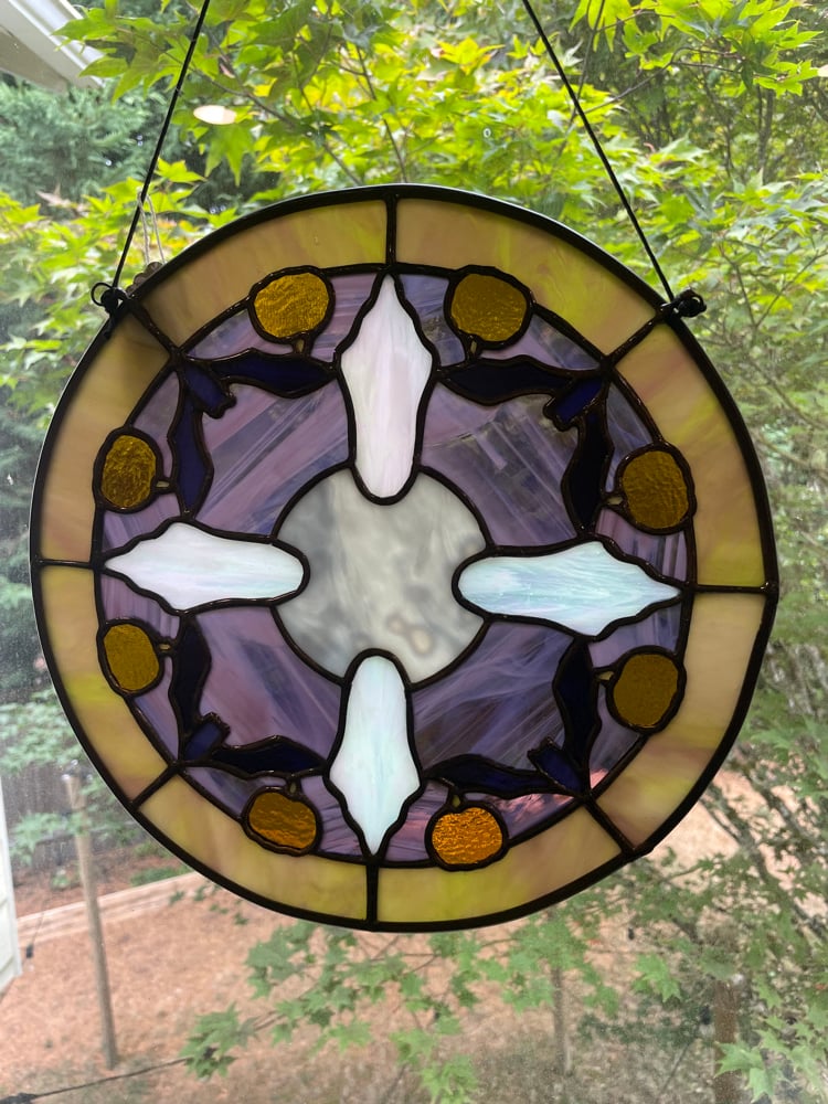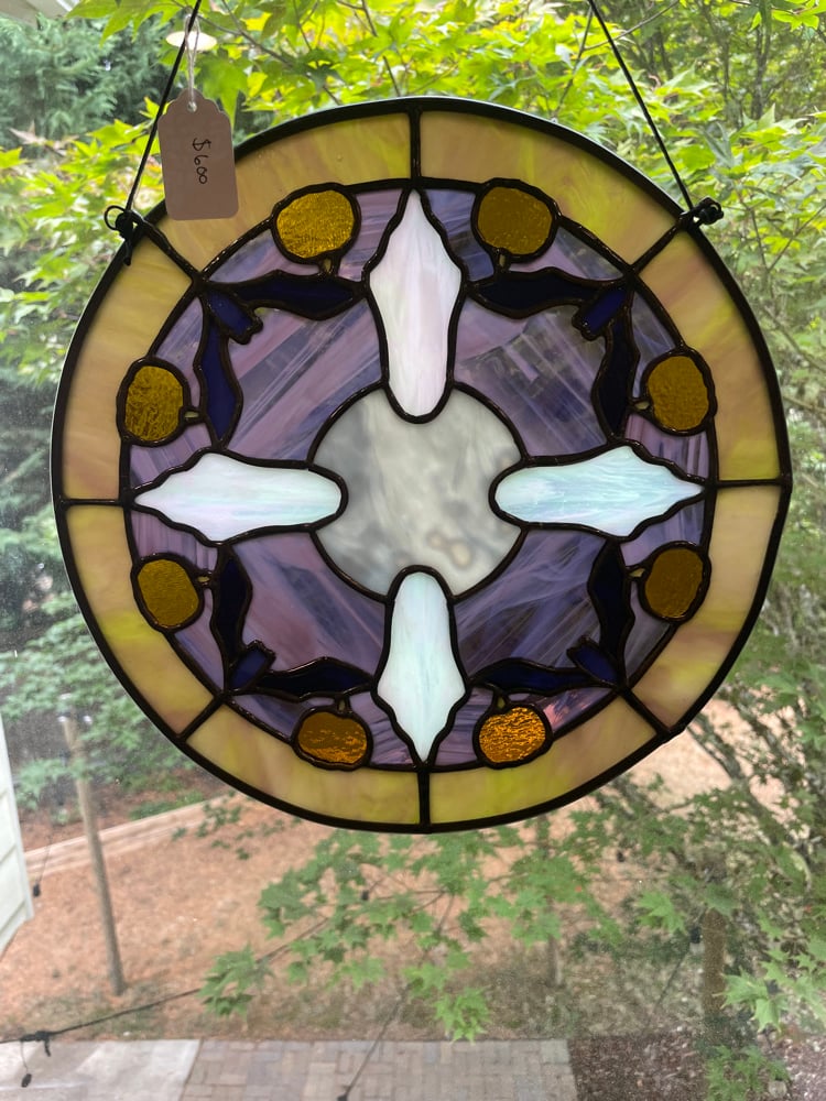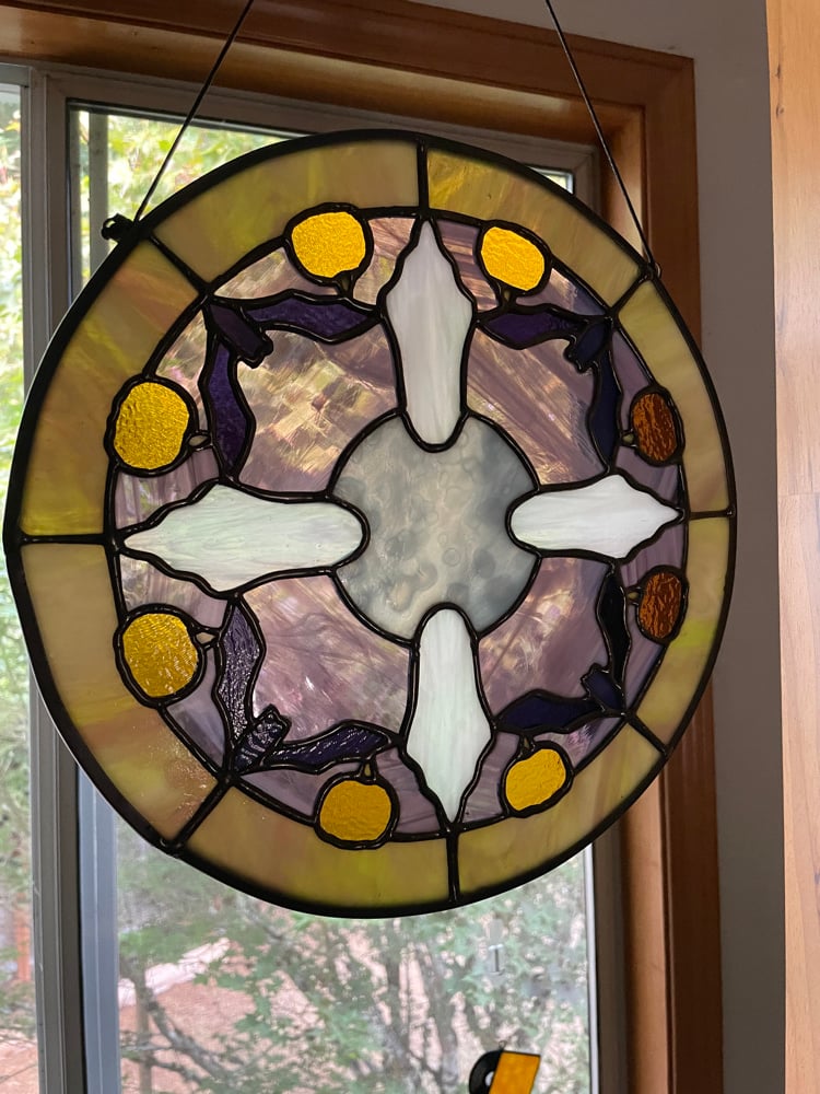 This piece is perfect for Halloween lovers—or people who enjoy a bit of spooky all year long! Size is 11 by 11 inches and features a symmetrical design of ghosts, bats, pumpkins around a central moon. Created with the copper-foil method and lead solder, edged with lead came.