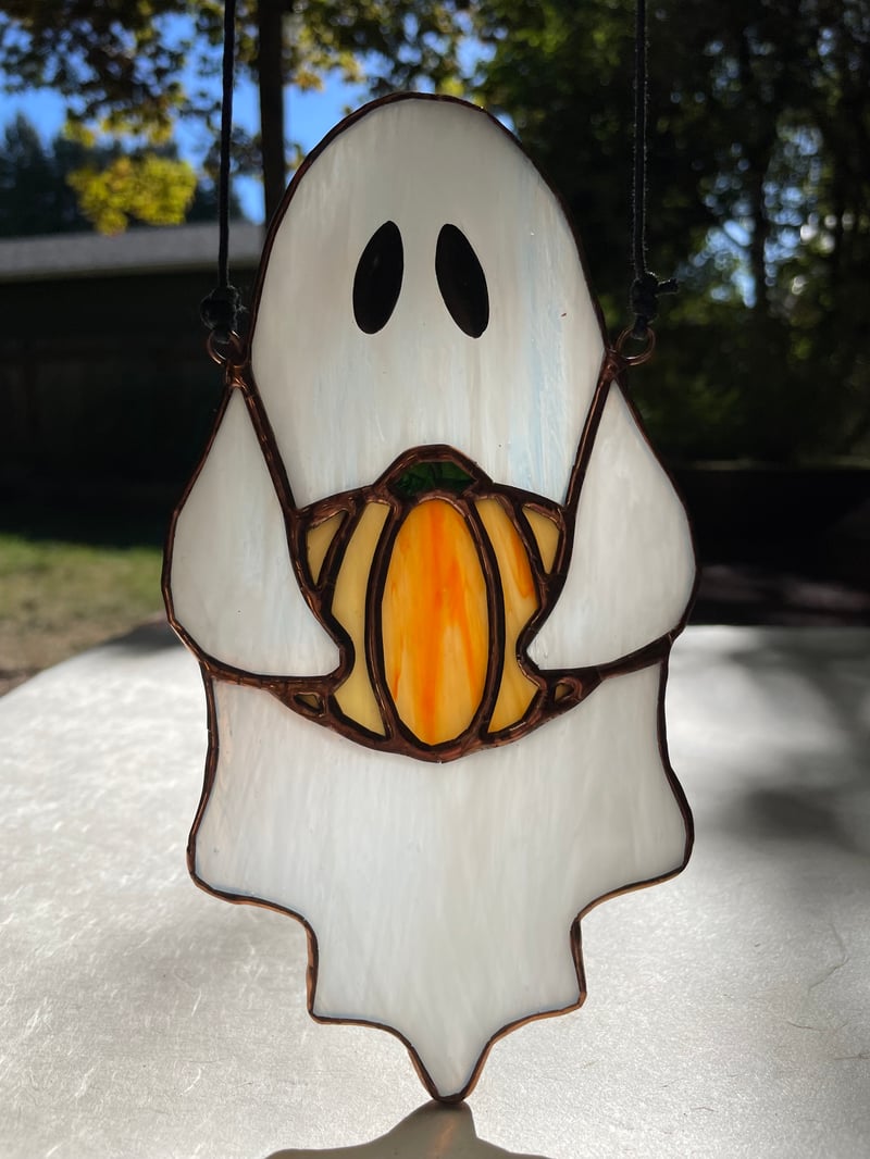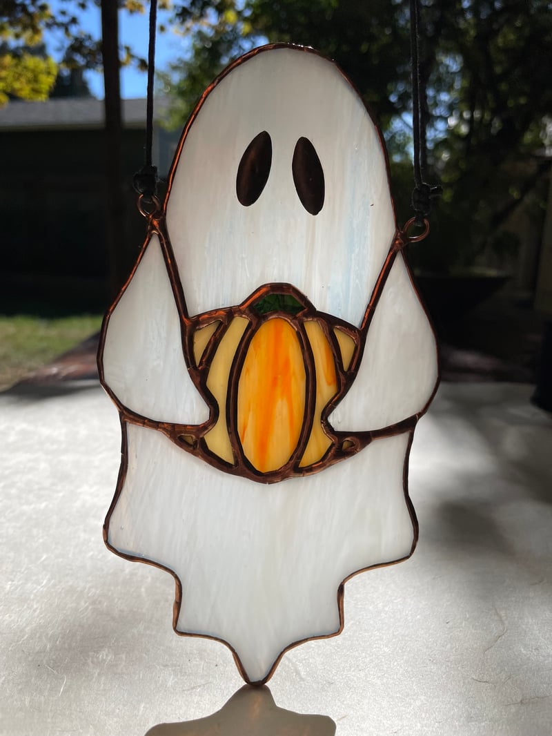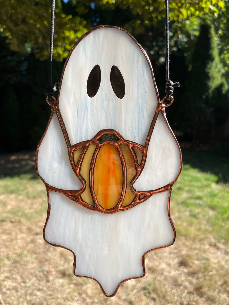 This spooky suncatcher is handcrafted, using whispy white/translucent, orange swirl, and funky green glass. It's soldered together using lead solder, with eyes made of lead solder too. It measures 4" by 7 1/2" (W xH).