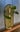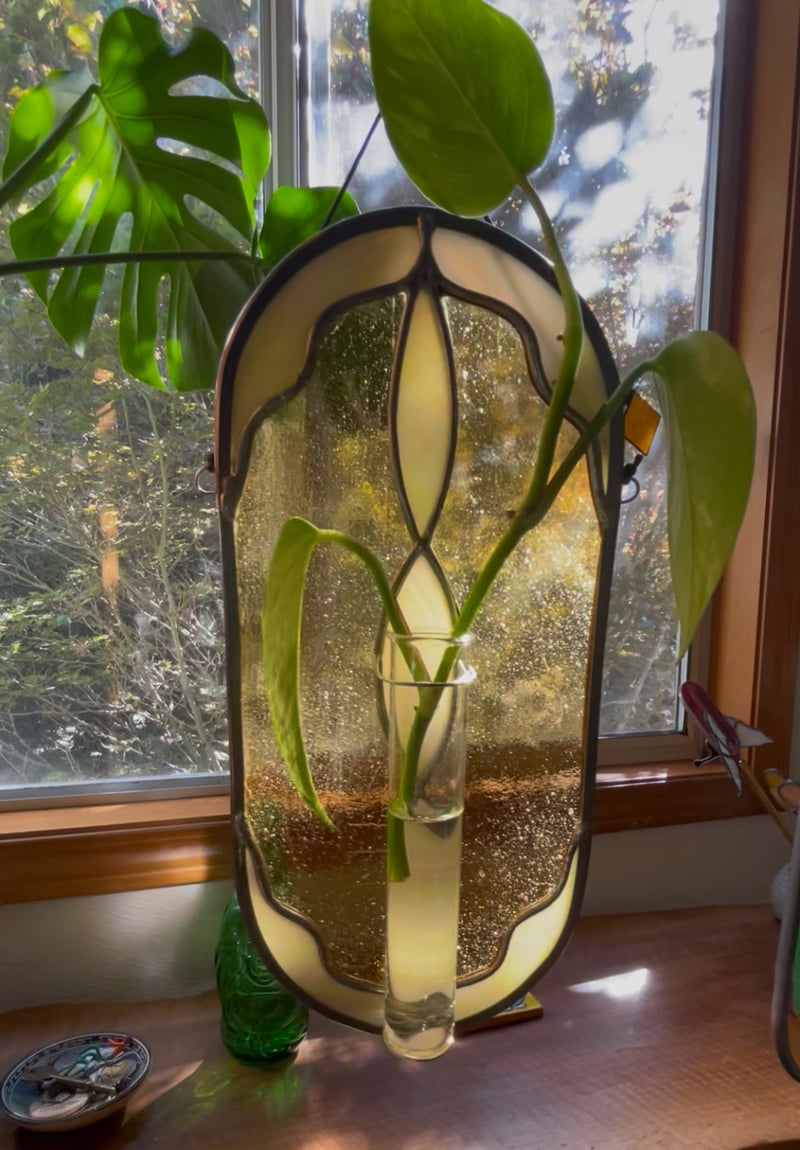 It is made with hand-cut stained glass in shades of swirled green, purple and white, and a golden orange/yellow translucent glass. It's soldered with lead solder, and the edging is lead came. It measures 5” by 11” (WxH).