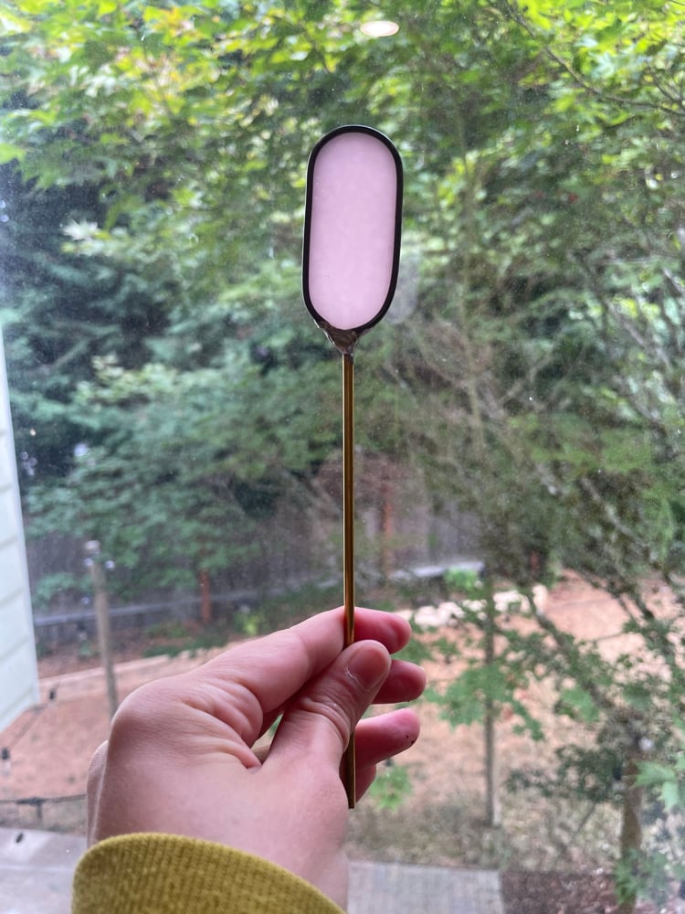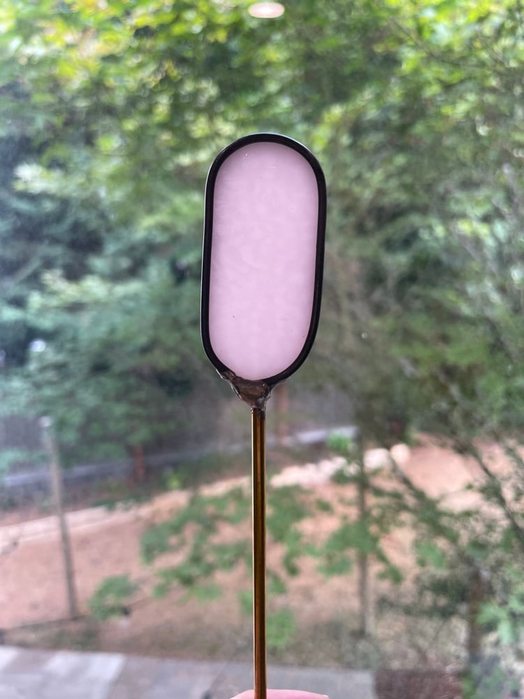 The brass stake is 6 inches long and glass is approximately a 1 by 2 inches (W by H). The glass is from Bullseye and is a baby pink color.