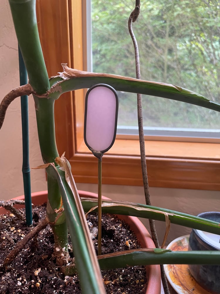 Important information: Try not to get water on the solder to reduce tarnishing. The portion of the stake under the soil will tarnish over time due to watering your plant and the wet soil. Do not let the glass/lead came edging touch the soil to reduce tarnishing of solder.